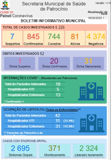 A Secretaria Municipal de Saúde de Patrocínio divulgou, na tarde desta quarta-feira (19), o novo boletim epidemiológico de coronavírus.