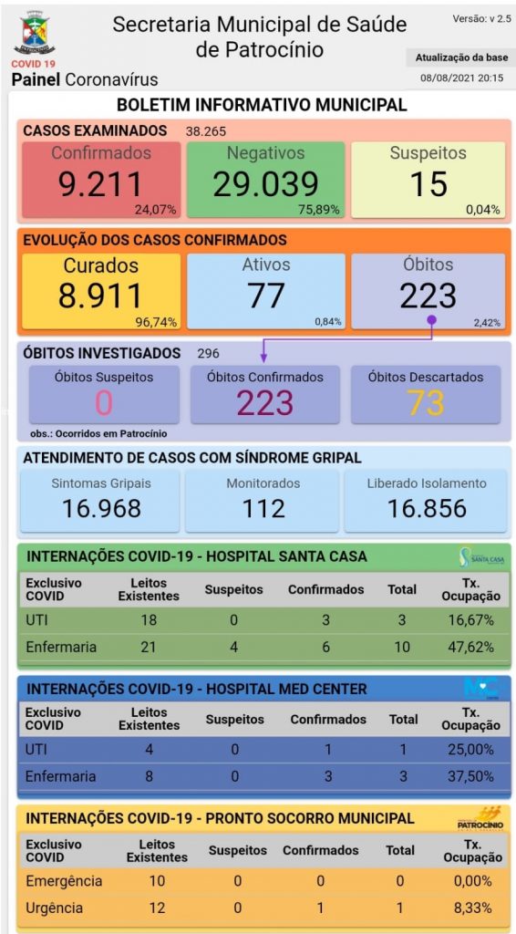 A Secretaria Municipal de Saúde de Patrocínio divulgou, na noite deste domingo (08), o novo boletim epidemiológico de coronavírus.