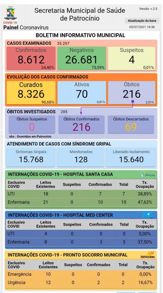 Na tarde desta segunda-feira (05), a Secretaria Municipal de Saúde de Patrocínio divulgou o novo boletim epidemiológico de coronavírus.