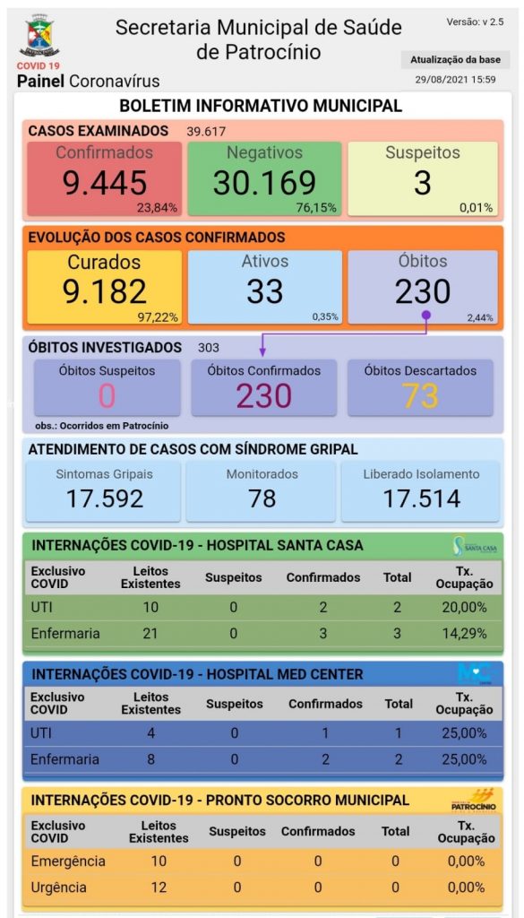 A Secretaria Municipal de Saúde de Patrocínio divulgou neste domingo (29) o novo boletim epidemiológico de coronavírus.