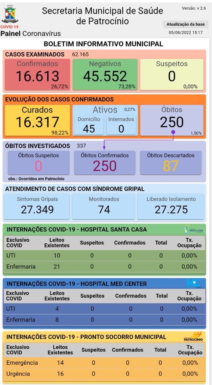 Nesta sextaa-feira (5), a Secretaria Municipal de Saúde de Patrocínio divulgou o novo boletim epidemiológico de Coronavírus.