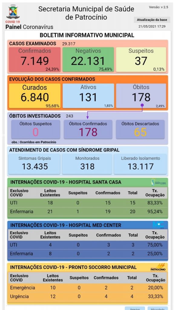 Na tarde desta sexta-feira (21), a Secretaria Municipal de Saúde de Patrocínio divulgou o novo boletim epidemiológico de coronavírus.