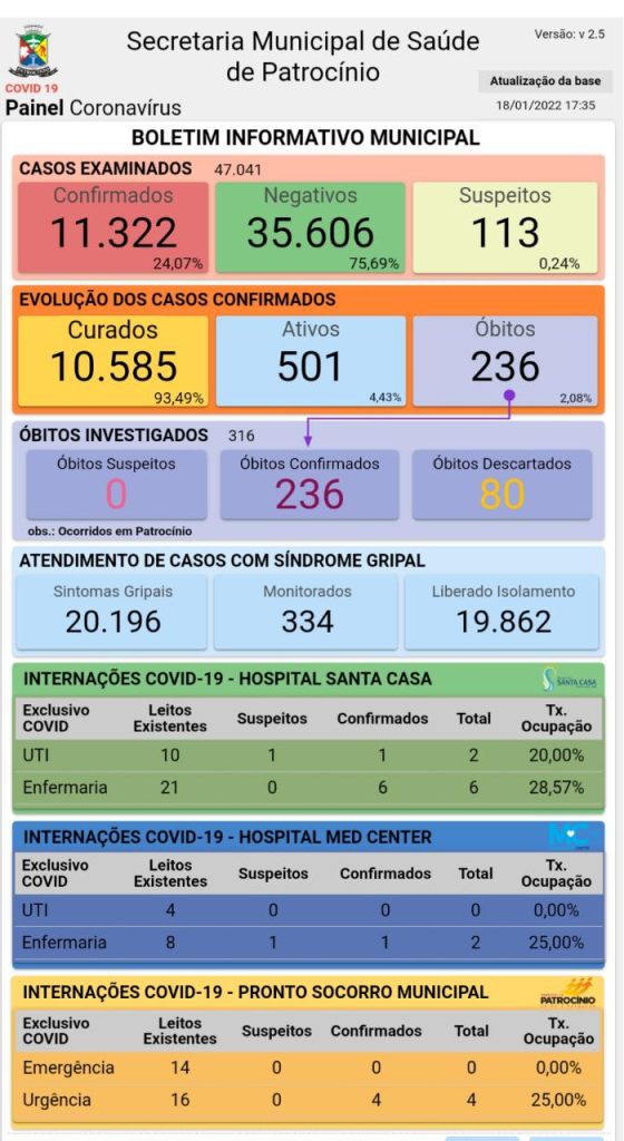 De acordo com os dados há um total de 11.322 casos no município, dentre eles 10.585 curados, 501 ativos e 113 suspeitos.
