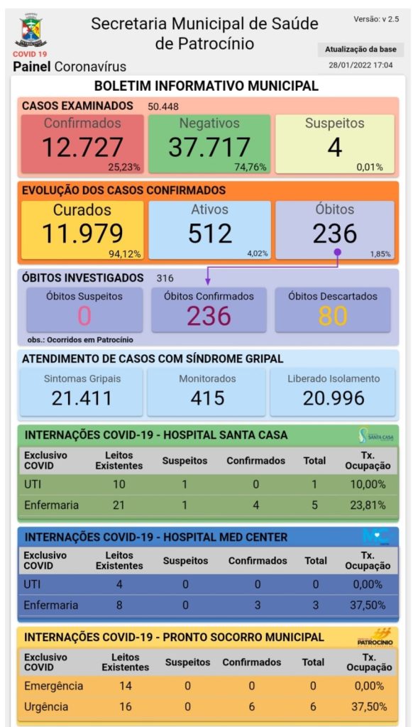 Nesta sexta-feira (28) a Secretaria Municipal de Saúde de Patrocínio divulgou o novo boletim epidemiológico de coronavírus.