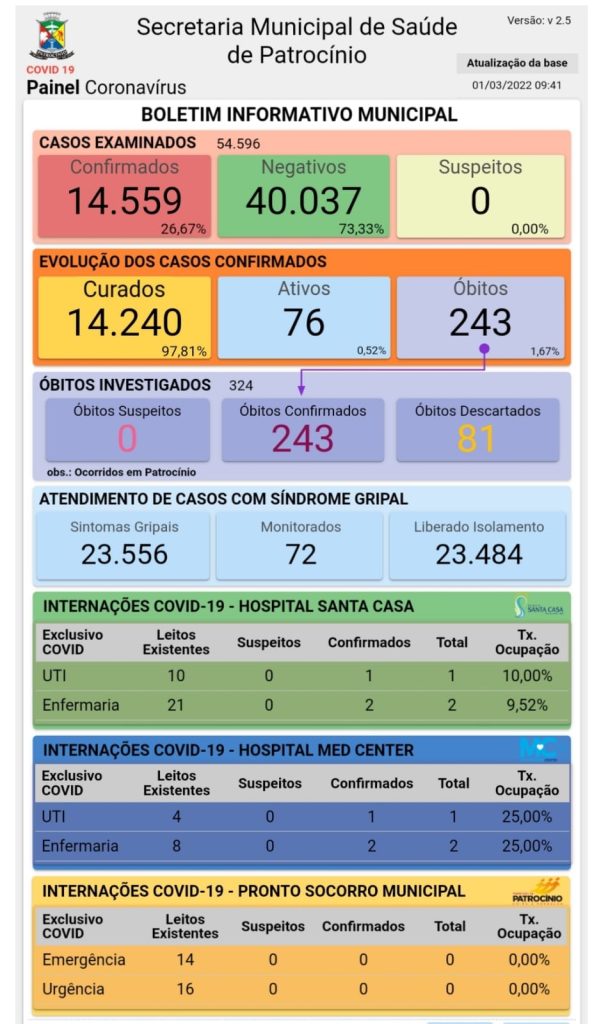 A Secretaria Municipal de Saúde de Patrocínio divulgou nesta terça-feira (01) o novo boletim epidemiológico de coronavírus.