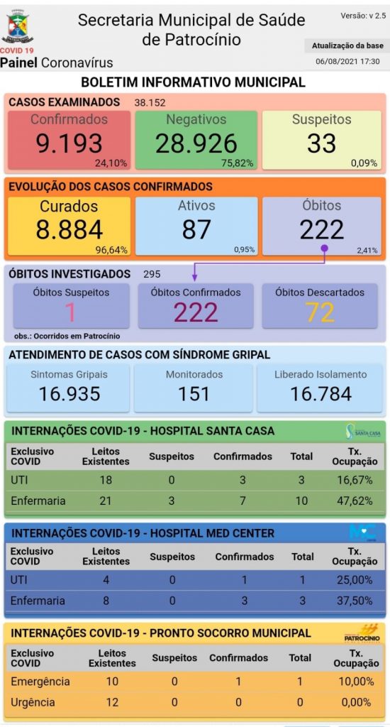 A Secretaria Municipal de Saúde de Patrocínio divulgou nesta sexta-feira (06) o novo boletim epidemiológico de coronavírus.