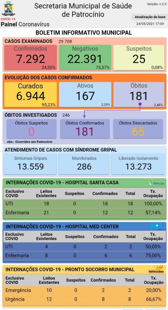 A Secretaria Municipal de Saúde de Patrocínio divulgou, na tarde desta segunda-feira (24), o novo boletim epidemiológico de coronavírus.