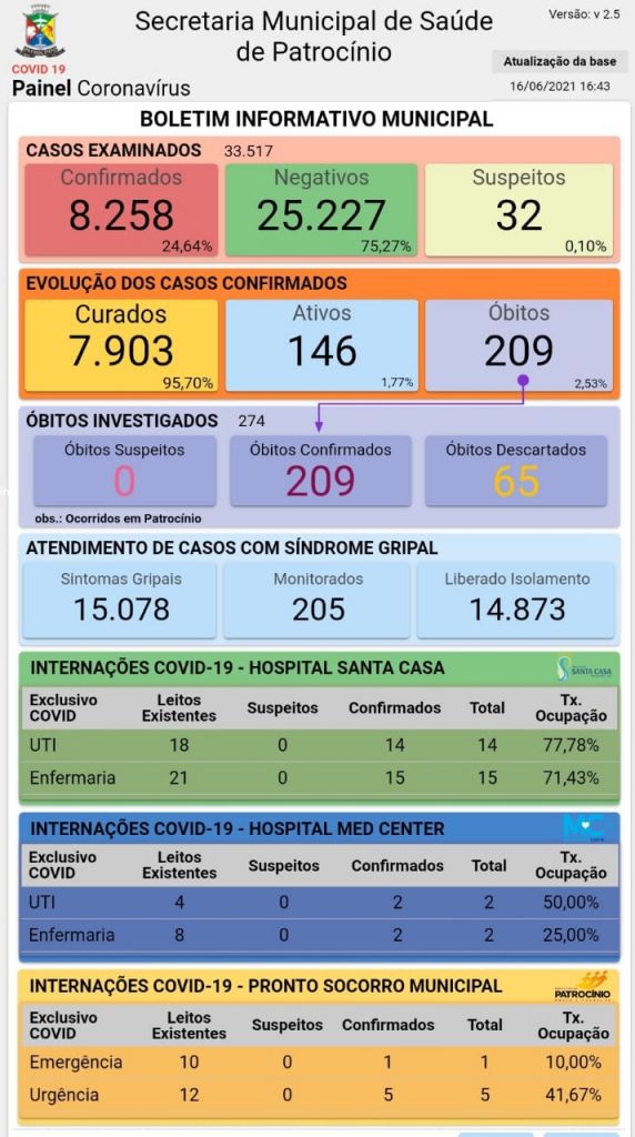 Na tarde desta quarta-feira (16), a Secretaria Municipal de Saúde de Patrocínio divulgou o novo boletim epidemiológico de coronavírus.