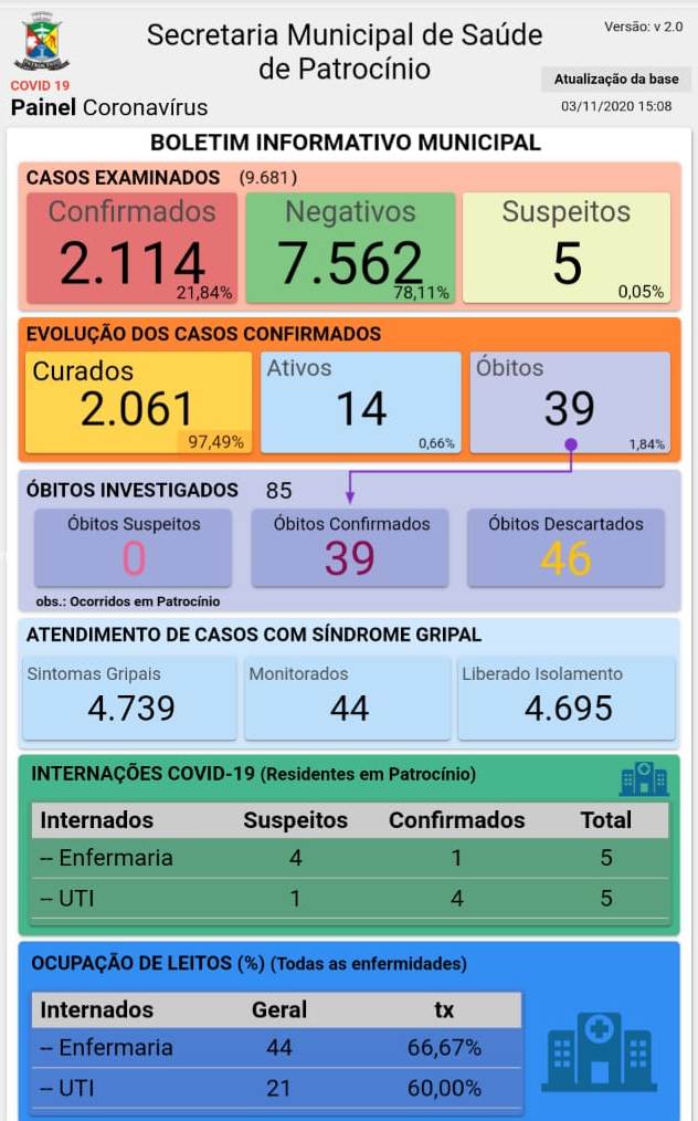 O novo boletim epidemiológico de coronavírus foi divulgado pela Secretaria Municipal de Saúde de Patrocínio nesta terça-feira (03).