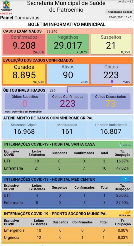 Na noite deste sábado (07) a Secretaria Municipal de Saúde de Patrocínio divulgou o novo boletim epidemiológico de coronavírus.