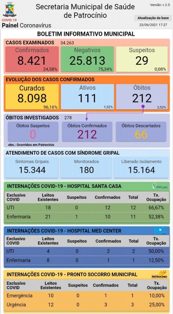Na tarde desta quarta-feira (23), a Secretaria Municipal de Saúde de Patrocínio divulgou o novo boletim epidemiológico de coronavírus.