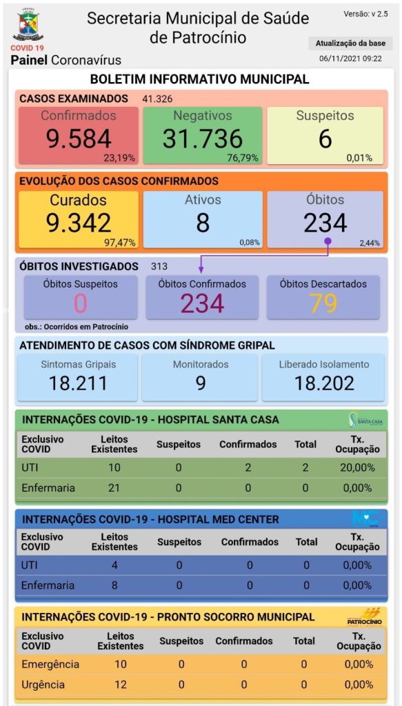 A Secretaria Municipal de Saúde de Patrocínio divulgou neste sábado (06) o boletim epidemiológico de coronavírus.