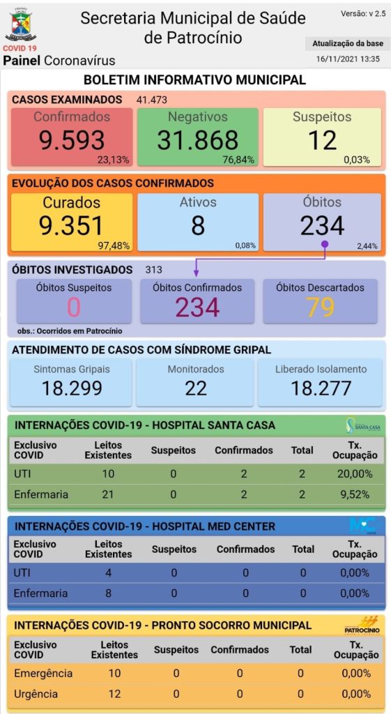 Em relação à ocupação hospitalar de pacientes confirmados e suspeitos de Covid–19 no município, há quatro pacientes internados. No Hospital Santa Casa, quatro pacientes, sendo dois na enfermaria e dois na Unidade de Terapia Intensiva (UTI). No Med Center e no Pronto Socorro não há pacientes.