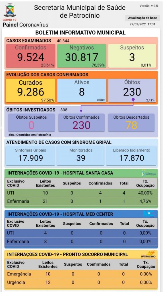 A Secretaria Municipal de Saúde de Patrocínio divulgou nesta segunda-feira (27) o novo boletim epidemiológico de coronavírus.