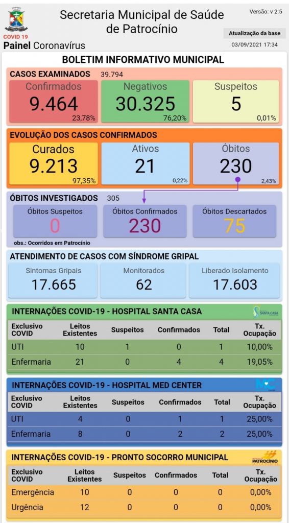 A Secretaria Municipal de Saúde de Patrocínio divulgou nesta sexta-feira (03) o novo boletim epidemiológico de coronavírus.