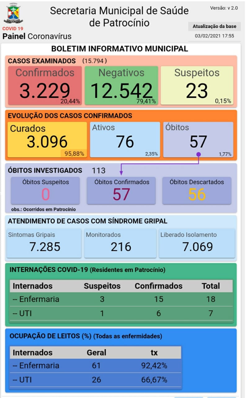 O novo boletim epidemiológico de coronavírus foi divulgado pela Secretaria Municipal de Saúde de Patrocínio na tarde desta quarta-feira (03).