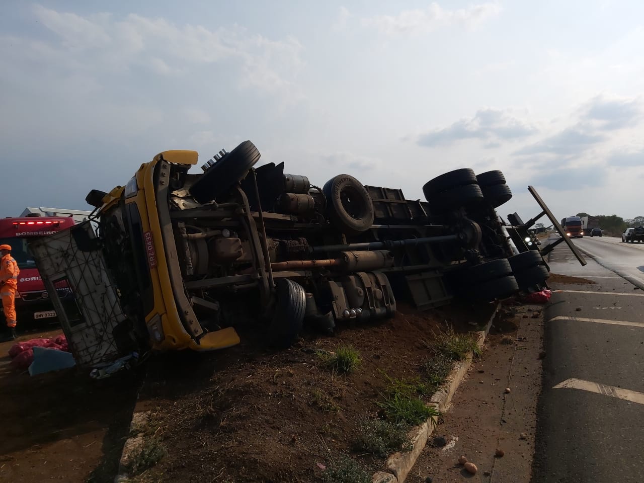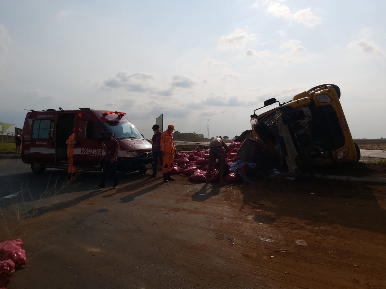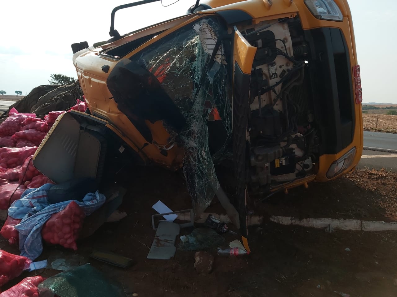 O Corpo de Bombeiros atendeu a um acidente, neste domingo, envolvendo um caminhão de batatas, na região de Patrocínio. O veículo se deslocava de Patrocínio à Patos de Minas, pela BR 365, e no trevo de acesso à Santana de Patos, por motivos não divulgados, saiu da pista e acabou tombando. O motorista, de 32 anos, foi atendido consciente e apresentava um corte na cabeça, e recusou a condução ao hospital, permanecendo no local.