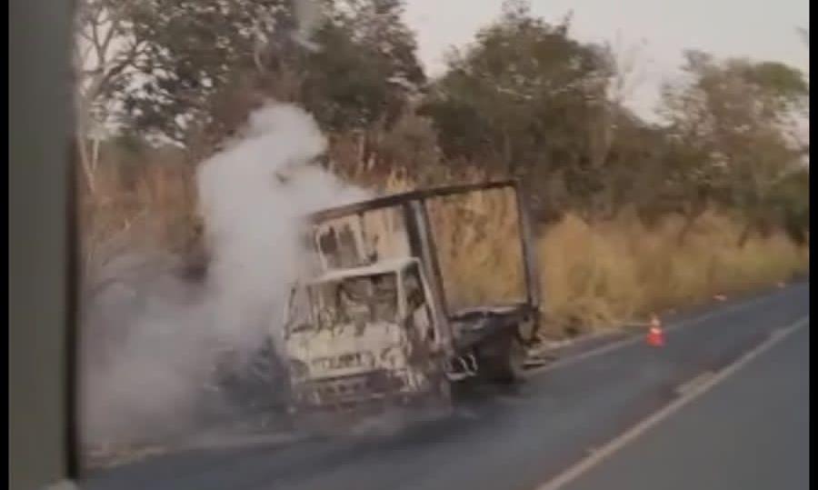 Caminhão pega fogo na BR-365 e fica completamente destruído