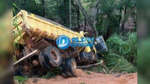 No momento do acidente, o condutor do caminhão invadiu a contramão de direção e, ao retornar para a pista correta, acabou saindo da rodovia e parando em um barranco às margens da estrada.