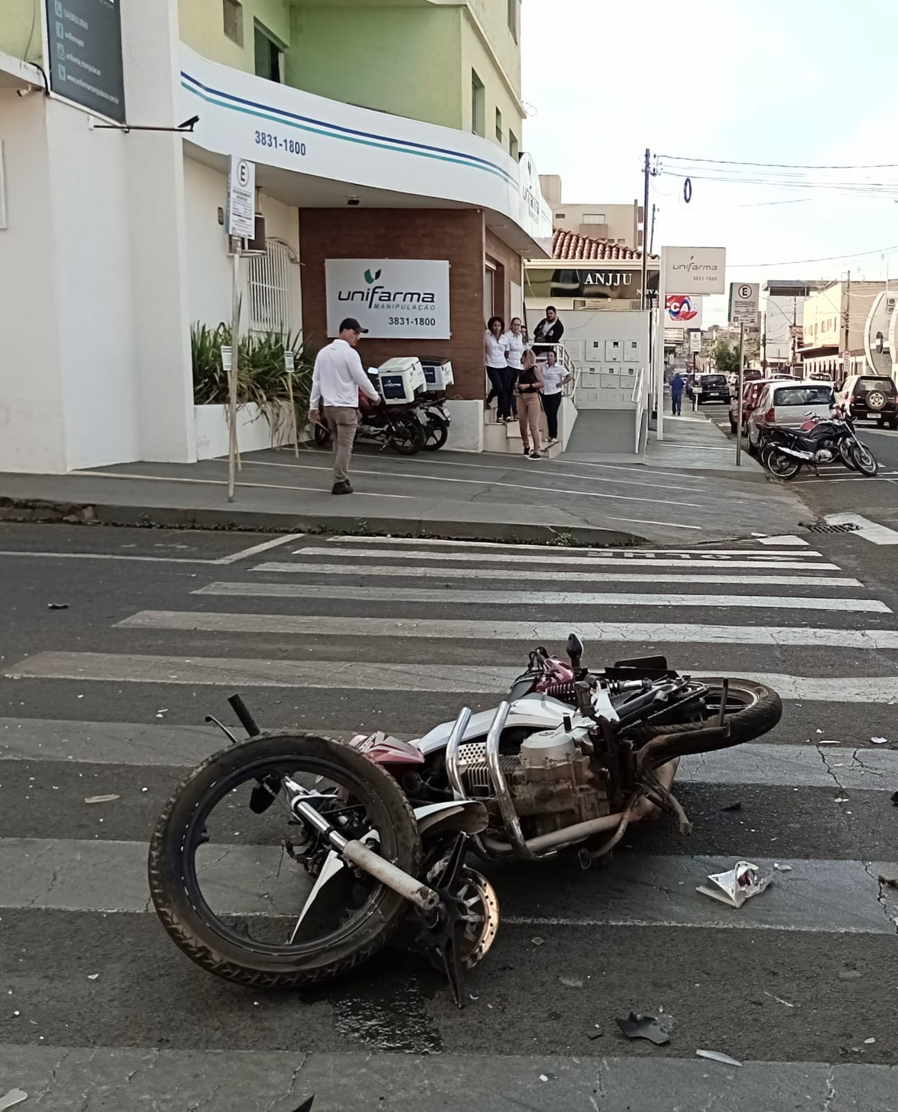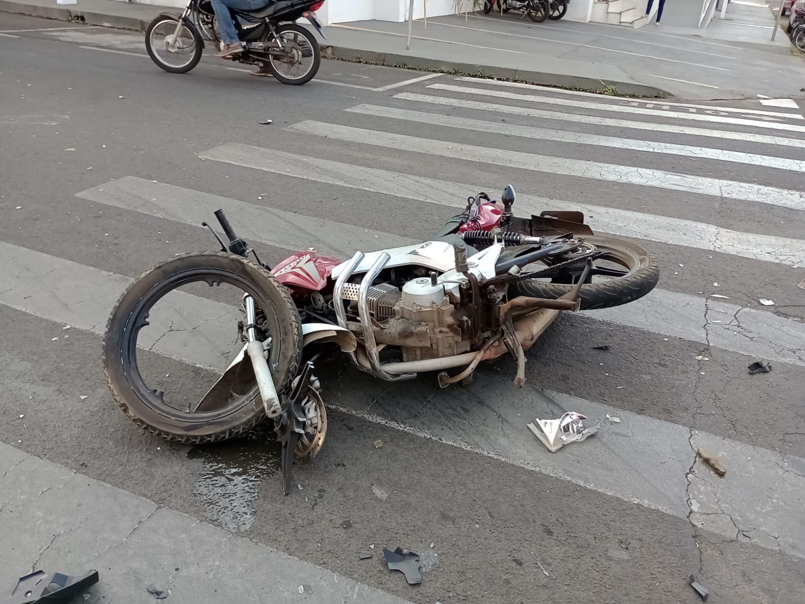 Caminhoneiro não respeita parada obrigatória e colide com motociclista no bairro Centro