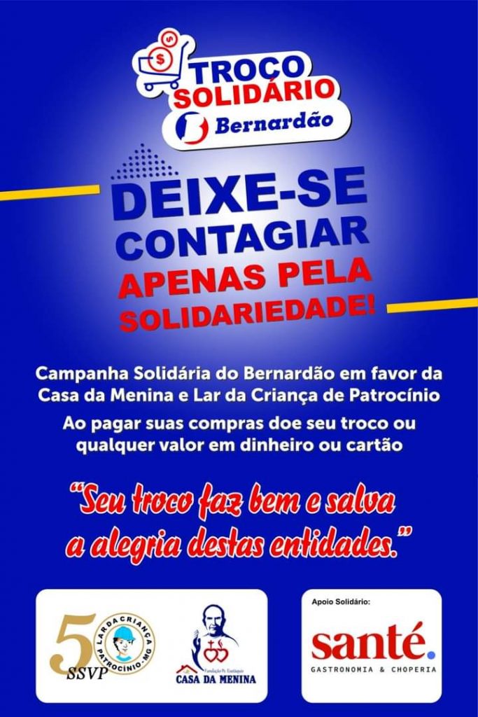 No fim de agosto, o Bernardão Supermercados iniciou a Campanha Troco Solidário, no qual as pessoas que compram nas lojas da rede em Patrocínio podem escolher doar seu troco.