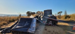 Carreta bitrem tomba e carga fica espalhada na MG-230