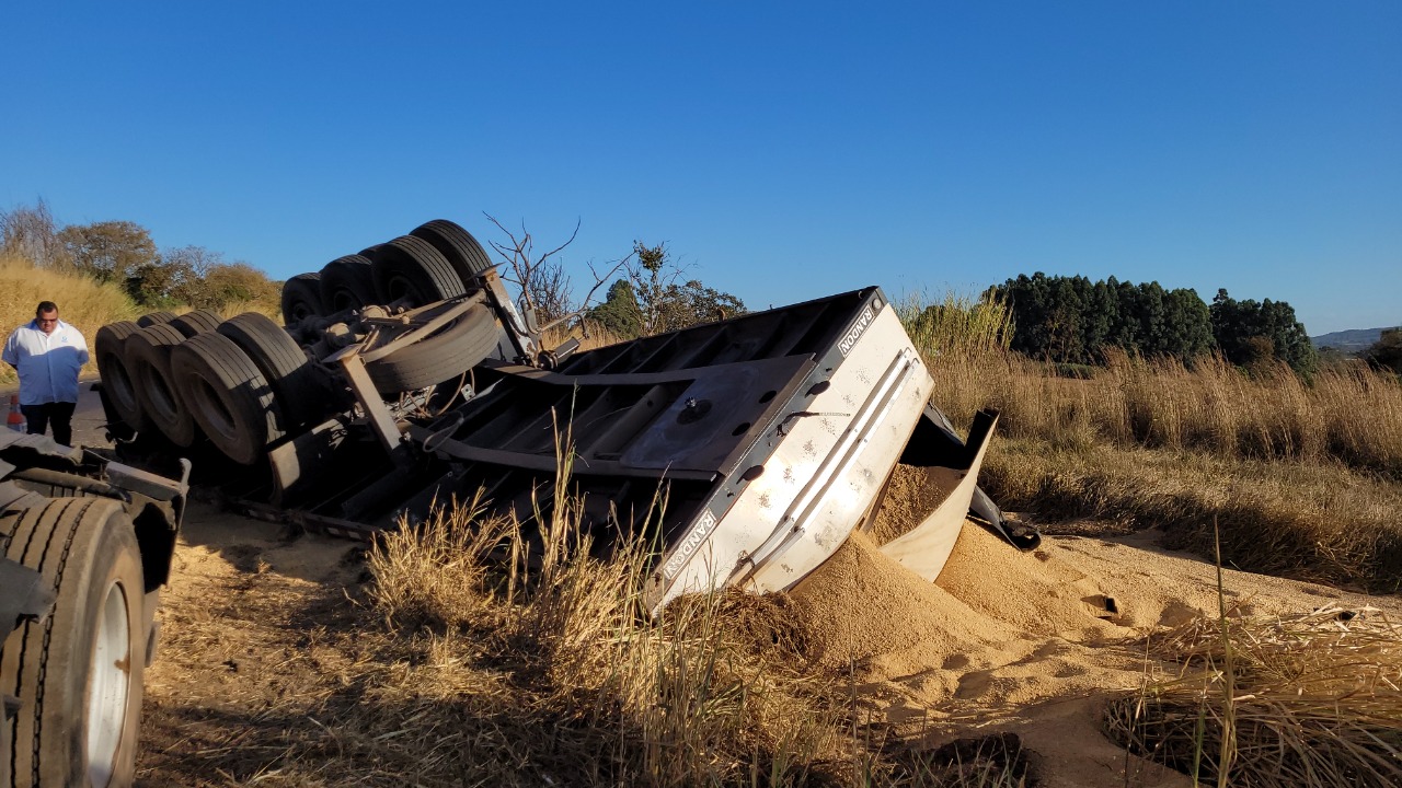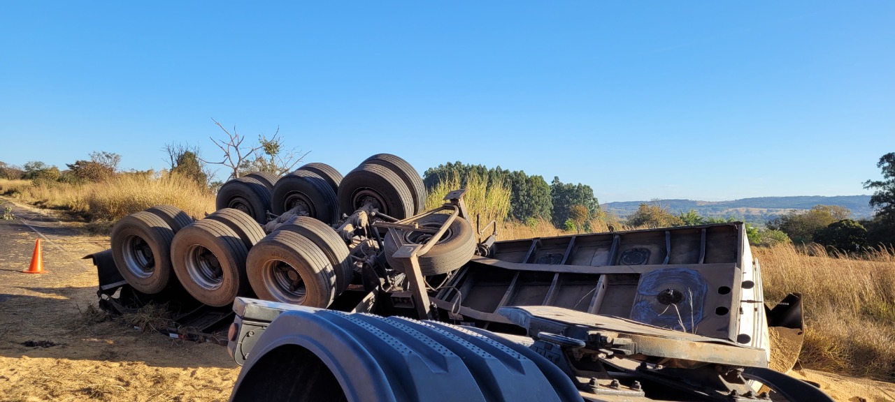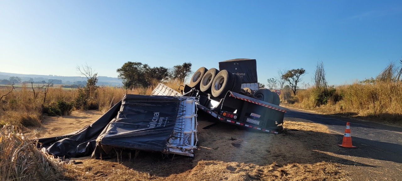 Carreta bitrem tomba e carga fica espalhada na MG-230