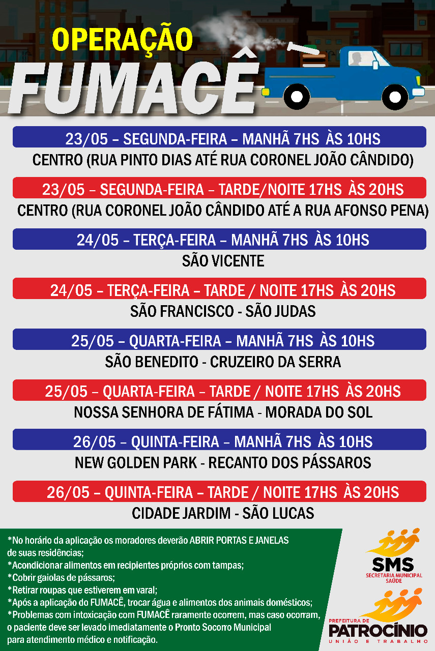 A Secretaria Municipal de Saúde, por meio da Vigilância Epidemiológica, continua com a ação do carro fumacê pela cidade de Patrocínio.