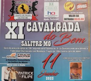 Neste domingo (11), Salitre de Minas sediará a 11ª edição da Cavalgada do Bem em prol do Hospital do Câncer de Patrocínio. O evento busca mobilizar a comunidade em uma ação solidária em benefício da instituição de saúde. A cavalgada terá início às 10 horas, partindo da praça da igreja e seguindo em direção à fazenda do Senhor Zé Quinzote, onde será servido um delicioso churrasco com mandioca. O percurso será de 10 km e contará com pontos de apoio ao longo do trajeto.