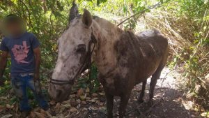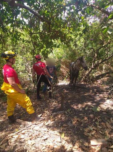 O animal estava afundado no brejo e com apenas a cabeça do lado de fora. O equino foi retirado do local, ficando aos cuidados do seu proprietário e sem ferimentos graves.