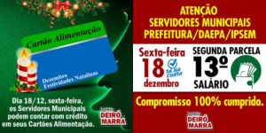 Conforme anunciado pelo prefeito Deiró Marra, através de suas redes sociais, será pago nesta sexta-feira (18), a segunda parcela do 13° salário do servidor público municipal. Além disso, o crédito de 160 reais no Cartão Alimentação referente à cesta de Natal também estará disponível.