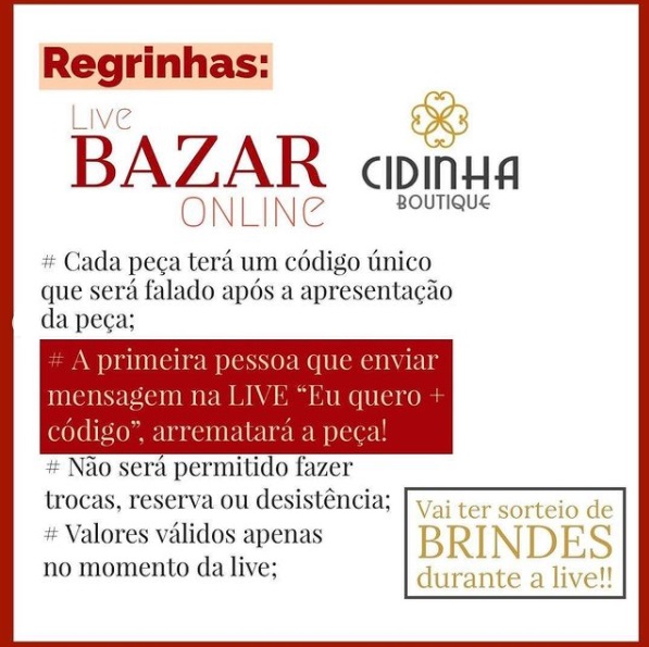 O Bazar será transmitido às 19h00 no instagram da Cidinha Boutique, @cidinhabout, e contém algumas regras para participação, conforme informativo abaixo: