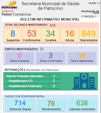 A Secretaria Municipal de Saúde de Patrocínio divulgou, na manhã desta quarta-feira (17), novo boletim epidemiológico sobre os casos de coronavírus no município .