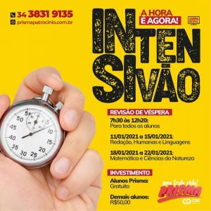 Na próxima segunda-feira (11), terá início o tradicional intensivão do ENEM do Colégio Prisma COC de Patrocínio. A ação visa atender alunos e não alunos da instituição de ensino.