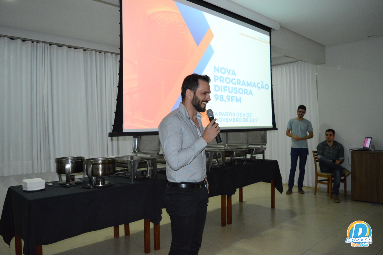Também tivemos a participação do Dr. Maurício Brandão, que também já faz parte do a nossa equipe de comentaristas, que falou sobre a importância do rádio na vida do brasileiro, que apesar do surgimento de vários outros canais de comunicação, ainda tem 89 por cento de audiências nos lares brasileiros. De forma que, no próximo dia 2 de outubro, a rádio AM 560, estará se transformado em FM 95, como disse nosso diretor de operações, será um renascimento da AM na fm. Mauricio Brandão em sua fala, lembrou também do nosso saudoso diretor-presidente Sr. Pedro Alves do Nascimento que acreditava sempre no desenvolvimento e crescimento de patrocínio, e seu amor por patrocínio e seu bairrismo, prosseguiu com dona Terezinha, seus filhos e conosco também, funcionários mais antigos. Portanto o Grupo Difusora de Comunicação conta com três emissoras FM, e vem ai mais uma novidade, aguardem.
