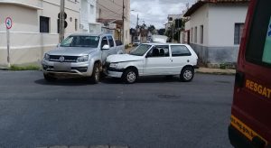 No local houve uma colisão entre dois veículos e de acordo com as informações o condutor que estava no veículo Fiat Uno, quando no cruzamento entre as ruas o mesmo veio a colidir com uma caminhonete.
