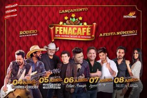 Entre 04 e 08 de abril acontece no parque de exposições de Patrocínio a Feira Nacional do Café (FENACAFÉ), que terá portões abertos à população. Os shows serão realizados na arena de rodeios, a exemplo dos anos anteriores em que era realizada a ExpoPatrô, também de portões abertos, quando estarão se apresentando: Fernando e Sorocaba (dia 04); Rionegro e Solimões (dia 05); Felipe Araújo (dia 06); Leonardo e Zé Felipe (dia 07) e no encerramento dia 08, a dupla patrocinense Talles e Larissa. Ainda haverá a etapa do Circuito de Rodeio Fivela de Prata e diversas atrações.