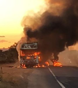 Em decorrência de uma pane elétrica, uma carreta carregada de farelo de soja começou a se incendiar no momento em que o condutor estacionou o veículo. Mais de quatro mil litros de água foram utilizados pelos militares para combater o incêndio no veículo que ficou completamente destruído pelas chamas.