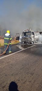 Um caminhão refrigerado que estava vazio apresentou problemas em um dos pneus dianteiros e começou a se incendiar nas proximidades do trevo de acesso a comunidade de Silvano. Acionados militares do 5° Pelotão do Corpo de Bombeiros foram para o local e conseguiram combater as chamas.