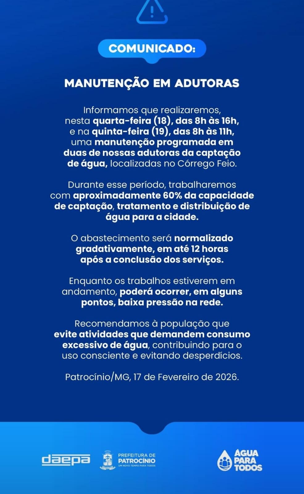 O Departamento de Água e Esgoto (Daepa), realizará uma manutenção programada em duas adutoras de captação de água, localizadas no Córrego Feio, nesta quarta-feira (18), das 8h às 16h, e na quinta-feira (19), das 8h às 11h.