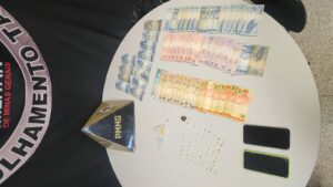 No invólucro dispensado foram encontradas 82 pedras de substância semelhante ao crack, prontas para a comercialização, além de uma porção da droga esfarelada e uma bucha de maconha. Em diligências posteriores, os militares localizaram ainda R$ 1.066 em dinheiro na residência de um dos suspeitos, quantia escondida em uma gaveta entre peças de roupa.