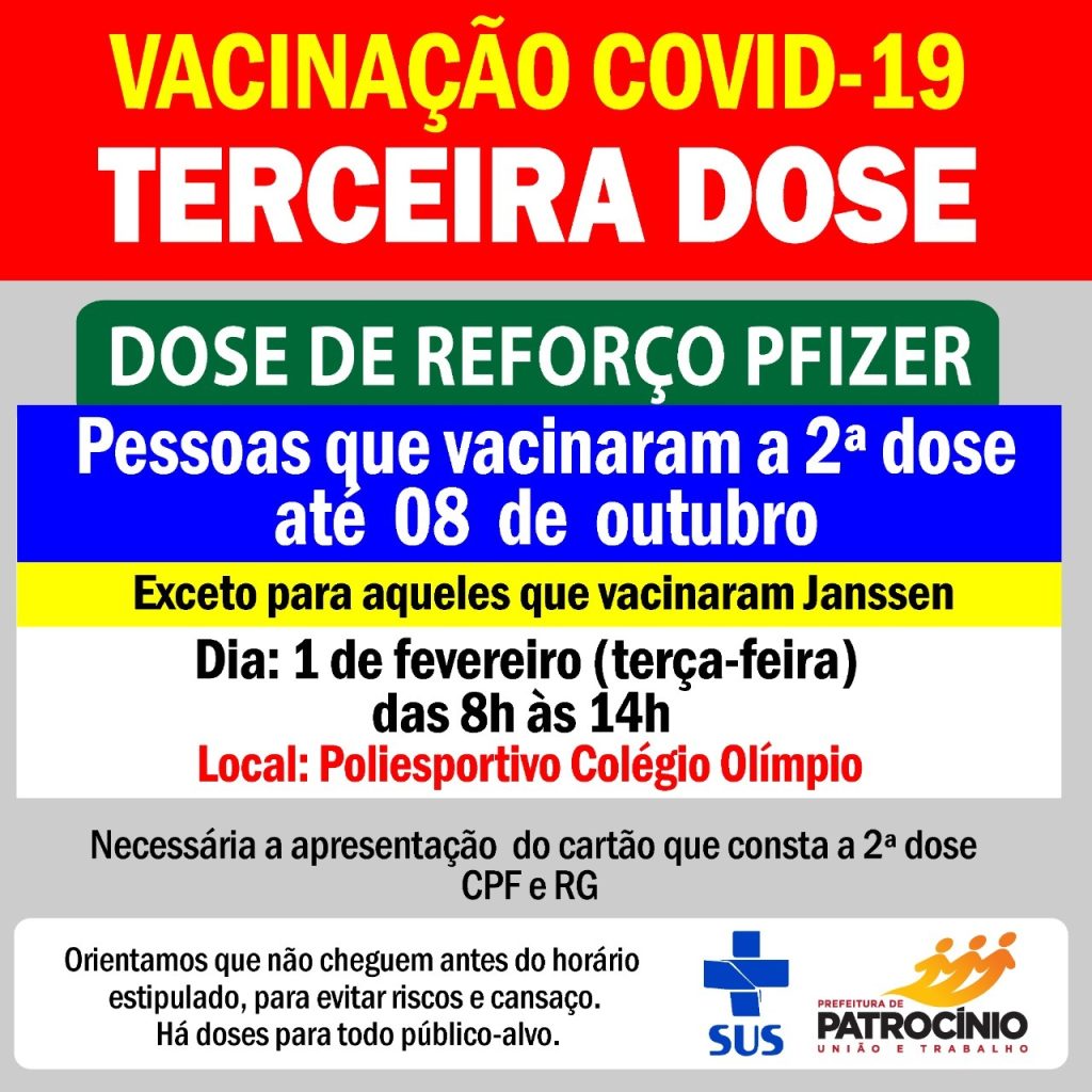 Nesta terça -feira (01) de fevereiro mais um público recebe a dose de reforço contra Covid-19, desta vez trata-se de pessoas que vacinaram a segunda dose até o dia 08 de outubro, com exceção daqueles que receberam a Janssen.
