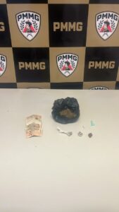 Com a presença e autorização dos responsáveis pelo imóvel, os policiais realizaram buscas no quarto do indivíduo, onde foram localizadas três buchas e um tablete de substância análoga à maconha, além de quantia em dinheiro.