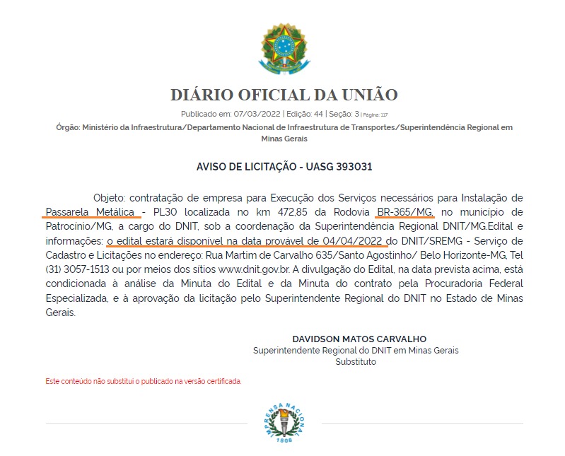 No último dia 07 de março foi publicado no Diário Oficial da União pelo Ministério de Infraestrutura, Departamento Nacional de Infraestrutura de Transportes e Superintendência Regional em Minas Gerais um aviso de licitação para a instalação de passarela metálica na BR-365, em Patrocínio (MG).