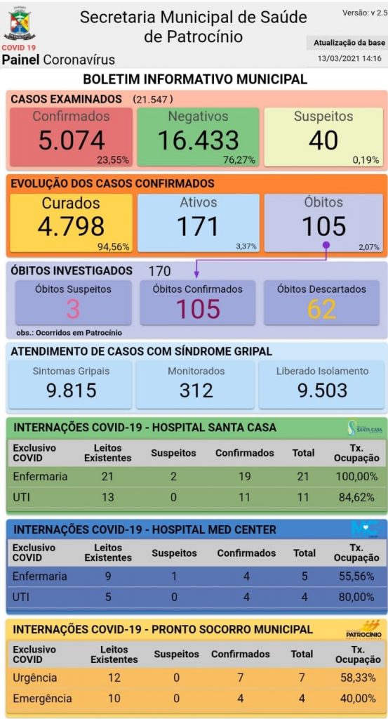 De acordo com o boletim, até o momento possuem 171 casos ativos e 40 suspeitos. No total o número de infectados pela Covid-19 em Patrocínio foram 5.074, destes 4.798 foram curados.