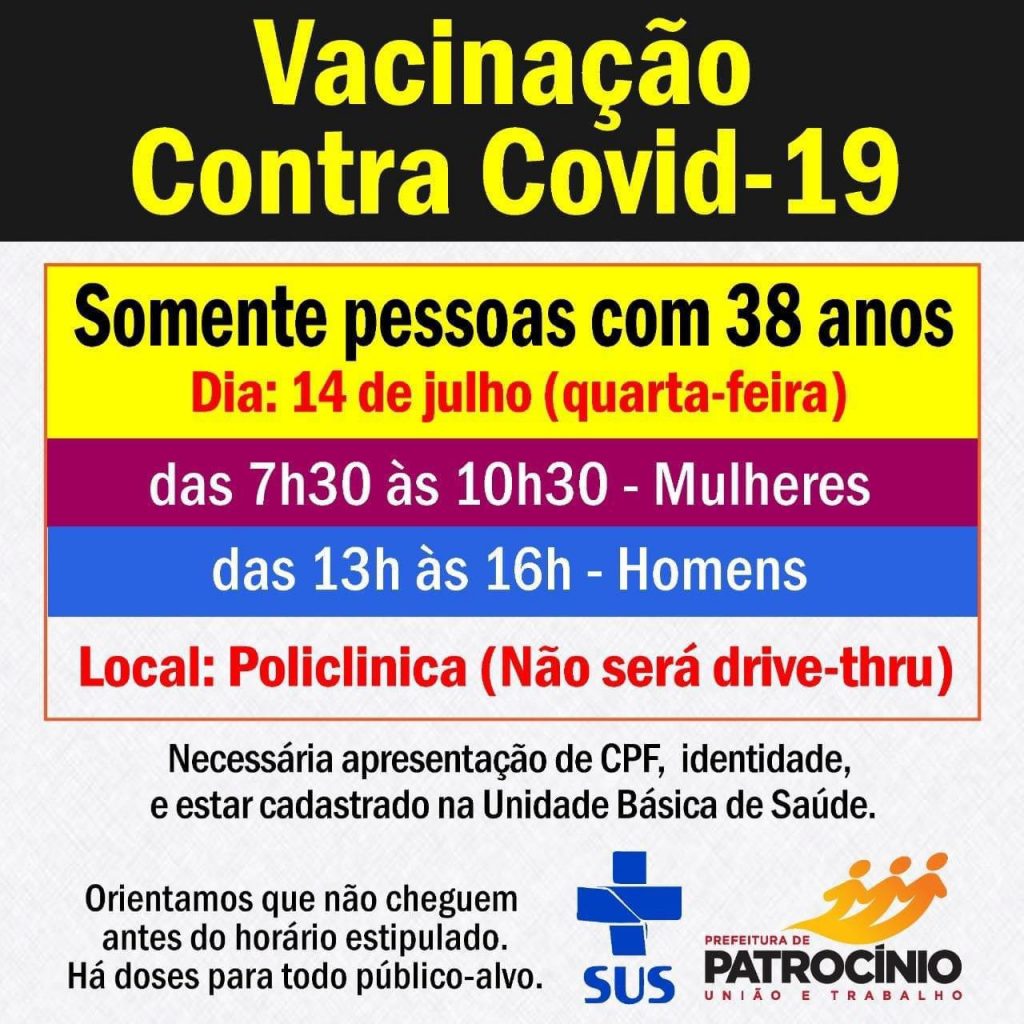 Em mais uma etapa de vacinação contra COVID-19 em Patrocínio, serão imunizadas somente as pessoas de 38 anos, nesta quarta-feira, 14.