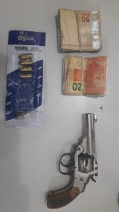 O autor e os materiais apreendidos, uma arma de fogo calibre .32, 10 munições intactas e R$ 2849,00 foram encaminhados à delegacia de Polícia Civil.