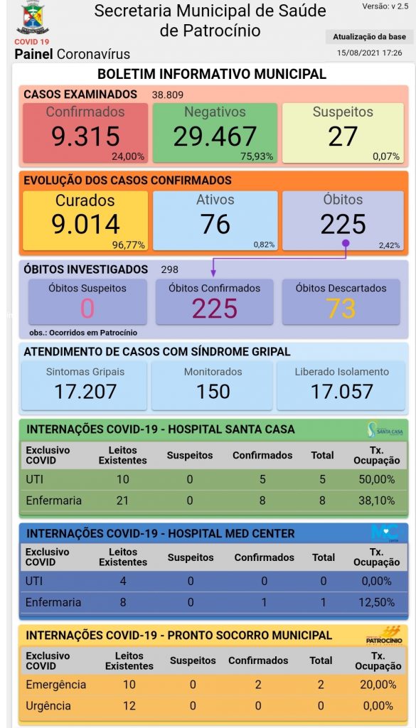 A Secretaria Municipal de Saúde de Patrocínio divulgou, na tarde deste domingo (15), o novo boletim epidemiológico de coronavírus.
