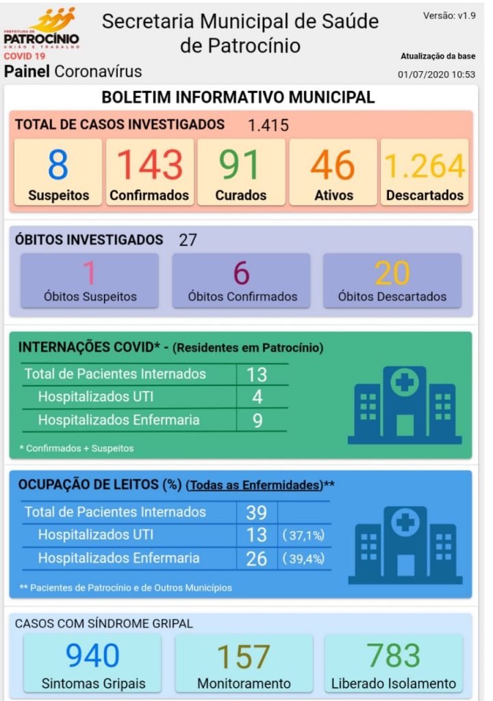 A Secretaria Municipal de Saúde de Patrocínio divulgou novo boletim epidemiológico de coronavírus na manhã desta quarta-feira (01).