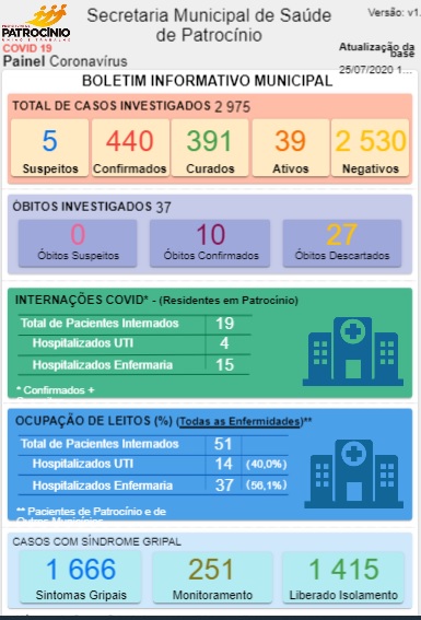 A Secretaria Municipal de Saúde de Patrocínio divulgou neste sábado (25) o novo boletim epidemiológico de coronavírus.